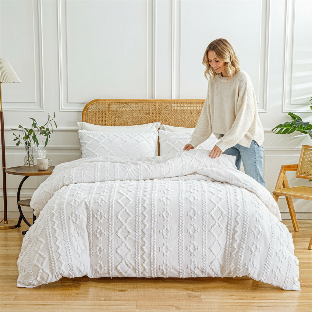 Confectionné avec un tissage tufté de qualité supérieure, doux au toucher et certifié selon la norme OEKO-TEX® Standard 100. Chaque tissu est testé pour garantir l’absence de substances nocives, assurant un confort aussi doux qu’un nuage, tout en étant sûr pour vous et votre maison.Élevez la qualité de votre sommeil.